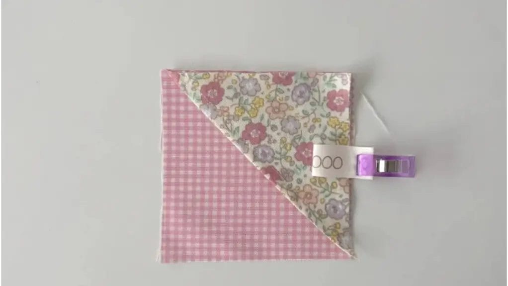 You'll start by folding one fabric piece into a triangle and sewing along its long edge before sandwiching it between two square fabric pieces placed right sides together.