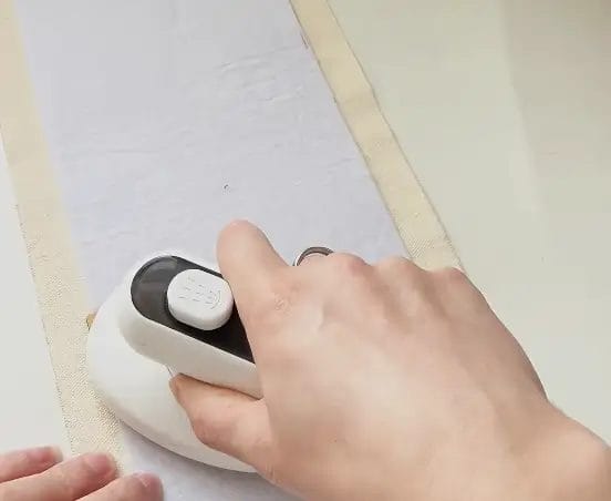 Roll one end of your fabric piece up towards the top. When you reach the top, carefully separate the outer fabric and lining fabric layers so they can wrap around the rolled section neatly. Sew along three edges where the batting lies to secure this rolled shape, leaving a small opening for turning.