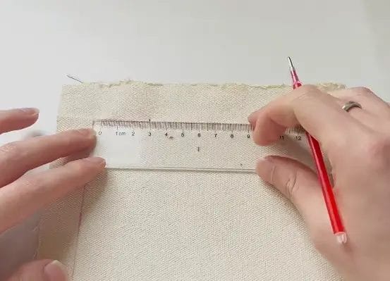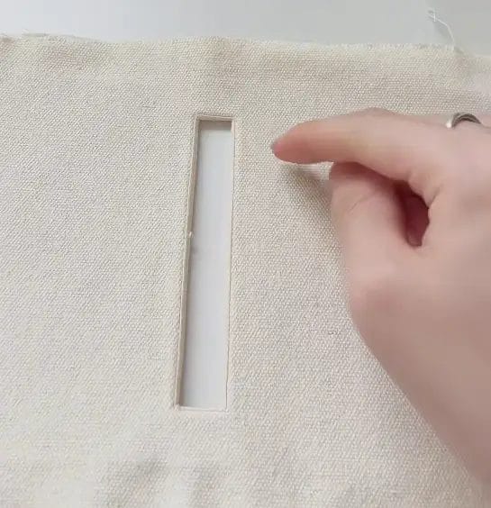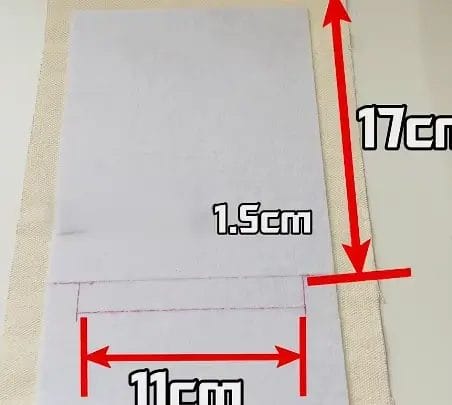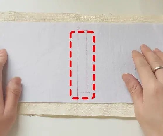 Using a fabric marker or chalk, draw the opening for the tissue dispensing slot on the batting side of the outer fabric. The opening should be 11 cm long and 1.5 cm wide. This cutout allows easy access to pull the toilet paper through.