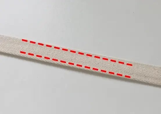 Take your herringbone twill tape and fold it lengthwise in half. Press with an iron to keep this fold crisp. Sew along both long edges with a narrow 0.1 cm topstitch to finish the handle strap neatly.