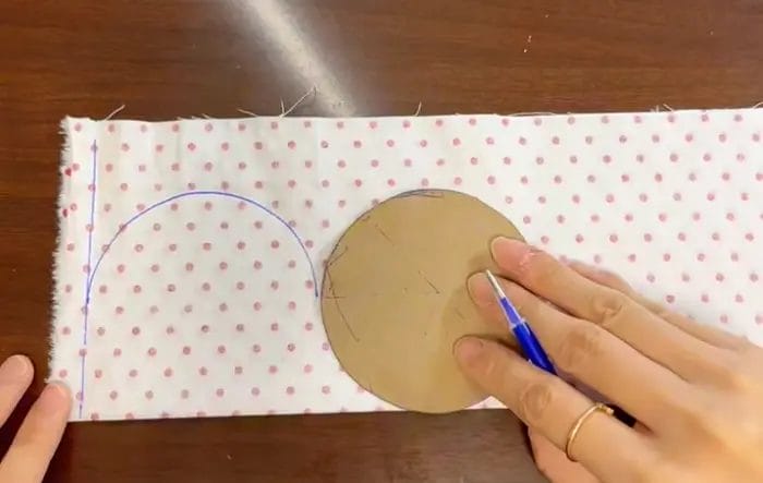 Using a marker, draw a vertical line about 1cm from the edge. This line will help you position the half-circles for the flower petals. Now, take your circular template and align it with the 15cm edge of the fabric. Next, draw half-circles along the template. You’ll want to draw a total of five half-circles to create the petals of your flower.
