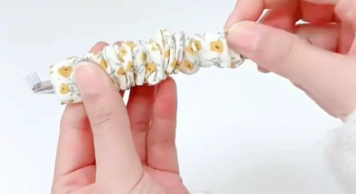 Next, take one of the elastic bands and thread it through the fabric you just prepared.