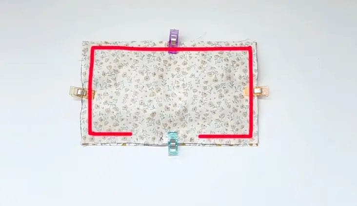 Align the ends of the handles with the edges of this fabric piece and secure them with clips.