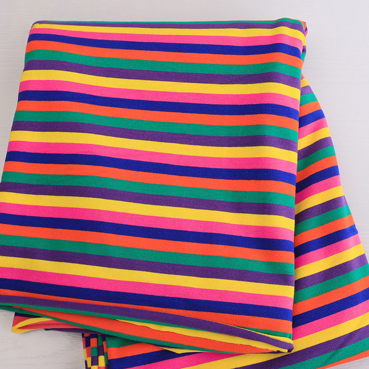 Enhance your designs with our Stripe Jersey Fabric, a perfect fusion of style, comfort, and durability. Made from premium cotton-spandex blend, this fabric is soft, breathable, and highly elastic, ensuring all-day comfort and a perfect fit.The vibrant stripe patterns add a modern yet timeless appeal, making it ideal for creating trendy t-shirts, dresses, casual wear, and activewear. Its sturdy construction guarantees long-lasting performance without compromising on flexibility or comfort.