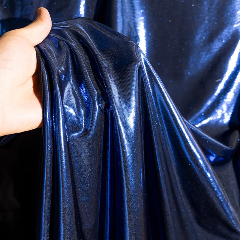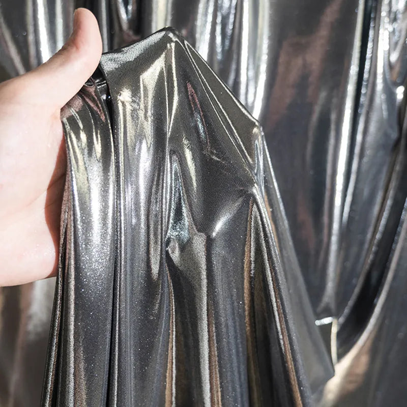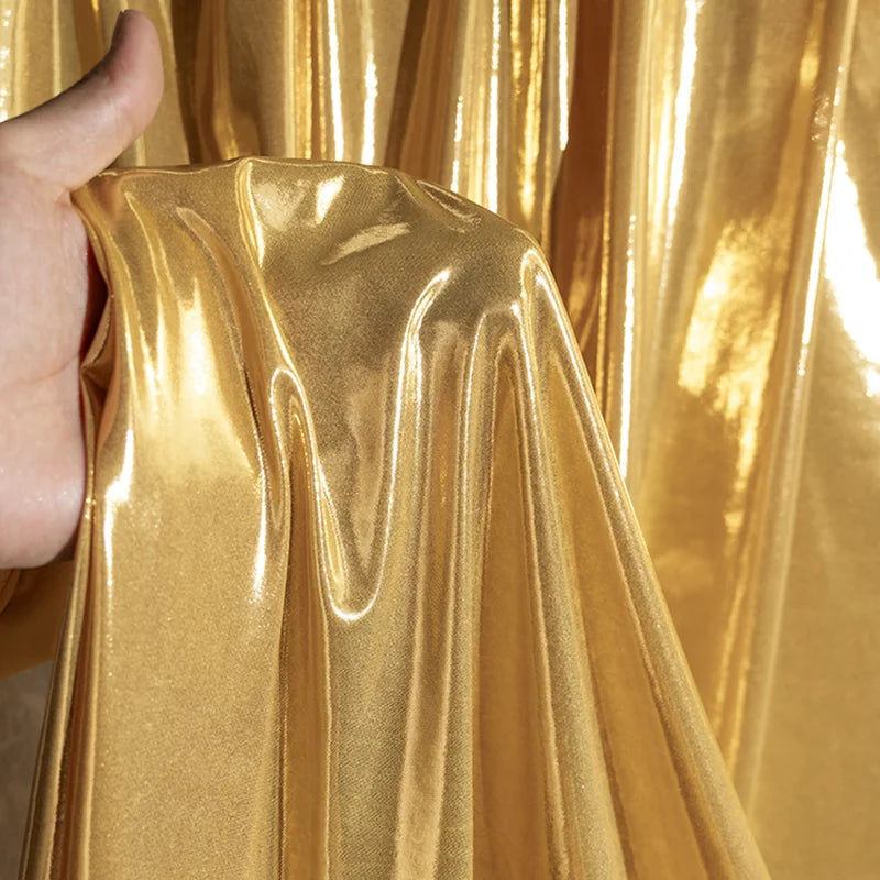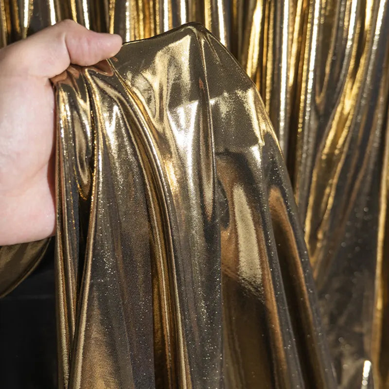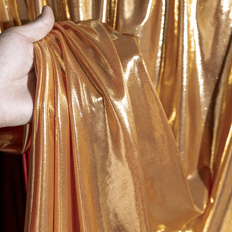 Perfect for special occasion wear, theatrical costumes, dance attire, and high-end fashion pieces, this versatile fabric offers both visual drama and practical durability. The tightly woven construction ensures longevity while maintaining its brilliant metallic luster through multiple uses. Its moderate stretch and excellent drape make it ideal for form-fitting designs and flowing garments alike.