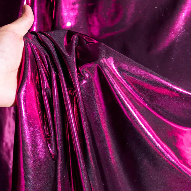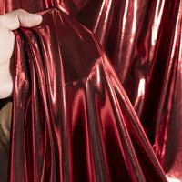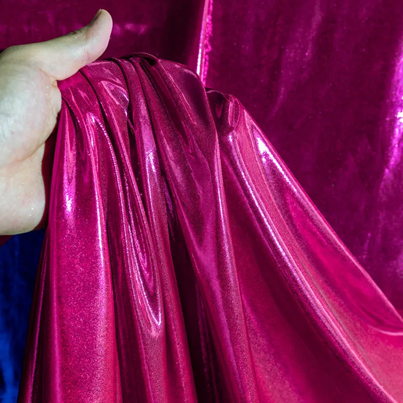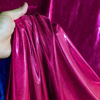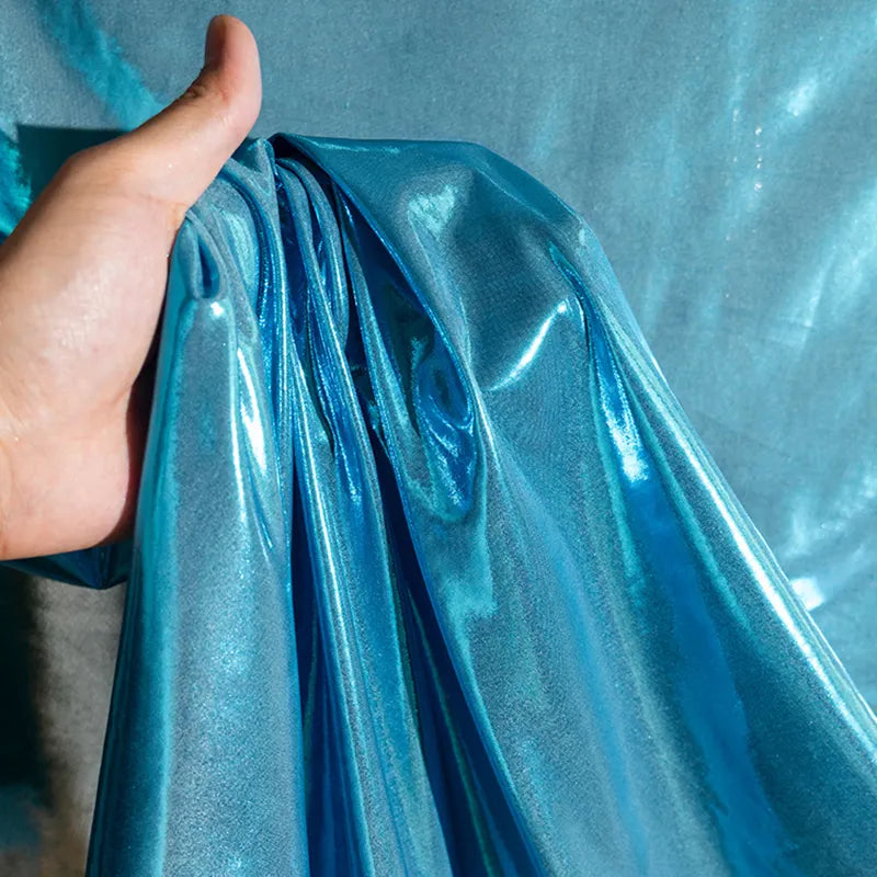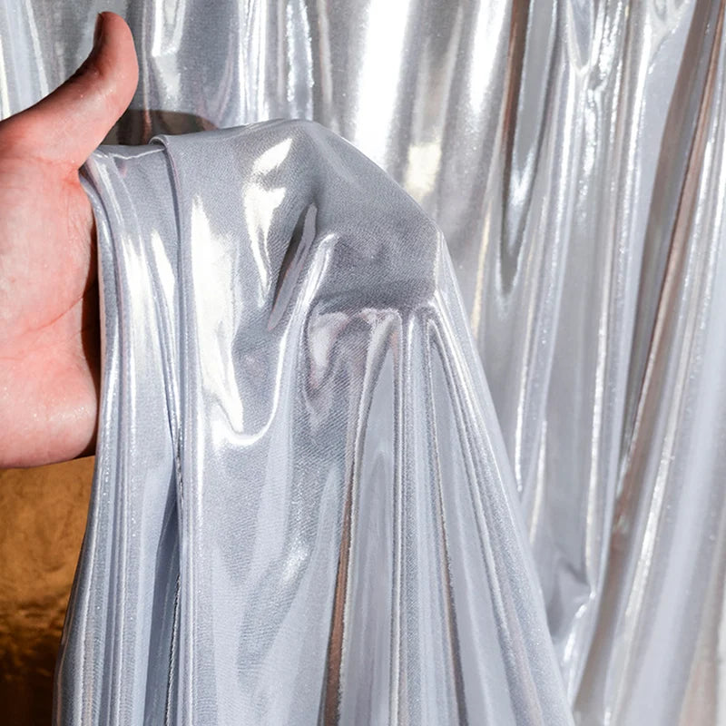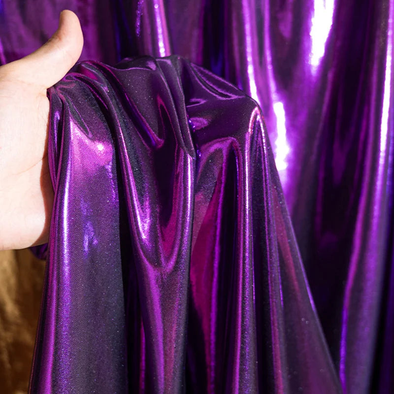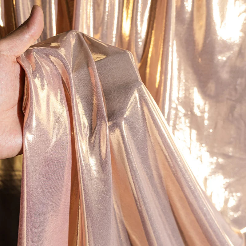 Transform your creations with our stunning Liquid Metallic Lame Fabric, a luxurious textile that captures and reflects light with its mesmerizing fluid-like sheen. This premium material features a distinctive metallic finish achieved through intricate weaving of metallic threads with base fibers, creating an eye-catching surface that shifts and shimmers with movement.