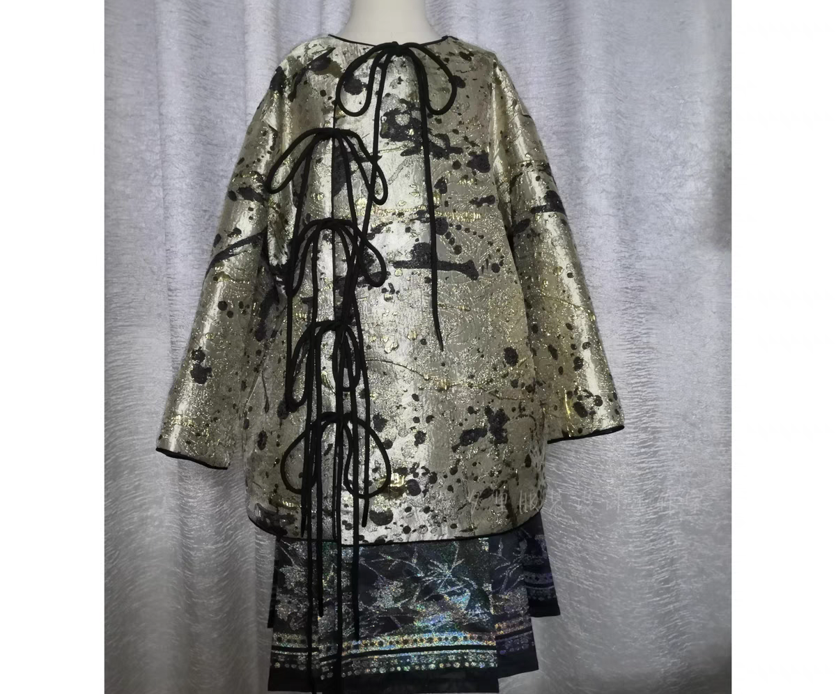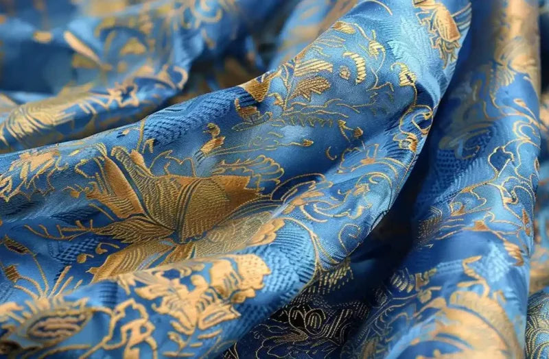 Our premium brocade fabric showcases the art of jacquard weaving at its finest. The interplay of gold metallic threads against a rich black backdrop creates a mesmerizing effect that catches the light beautifully.